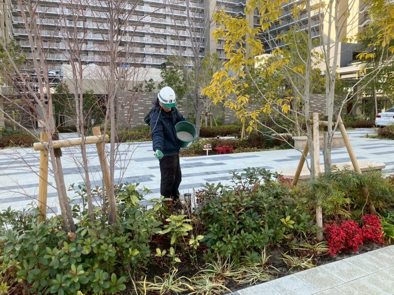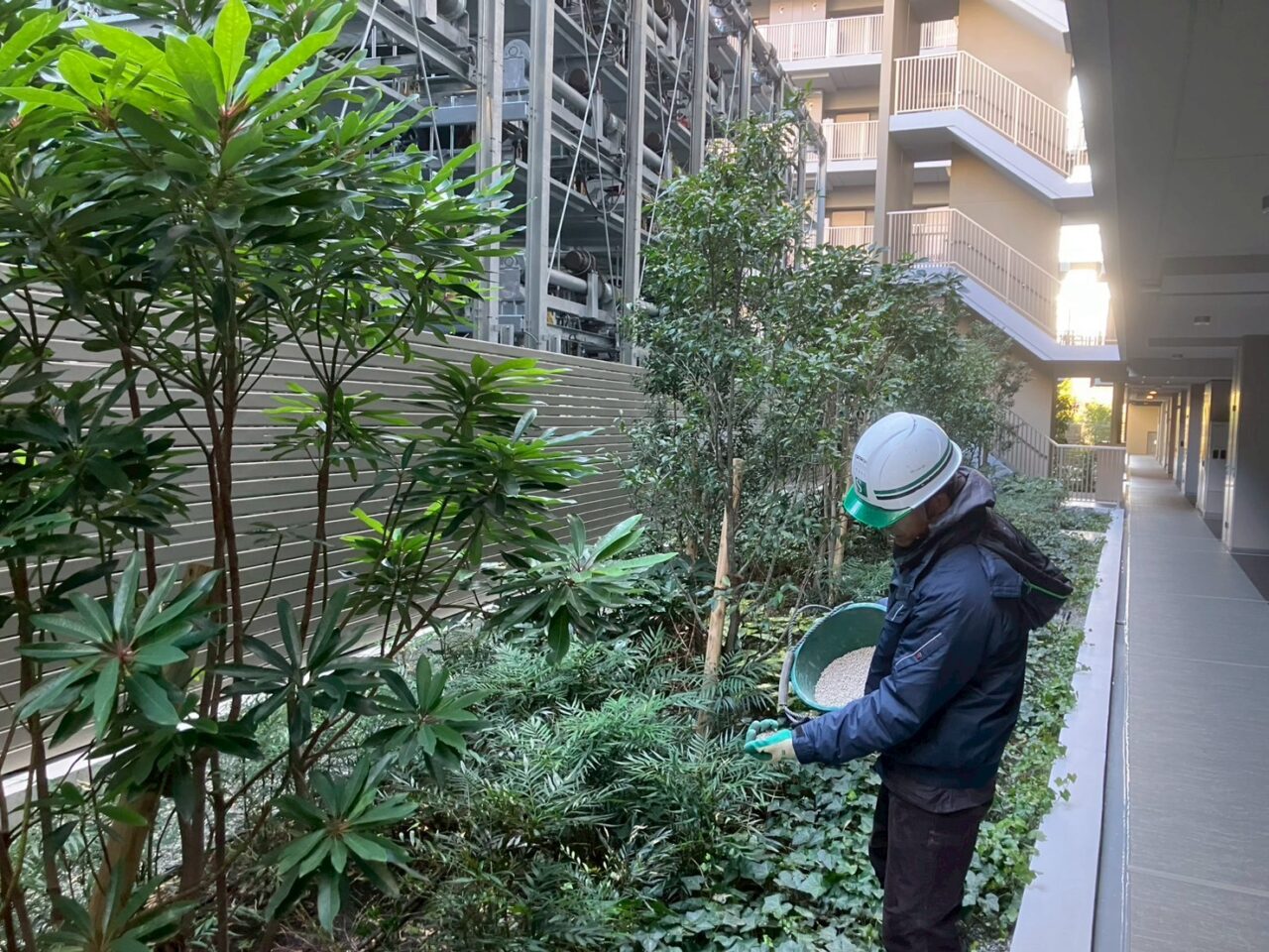 剪定後は、樹木の体力回復と来季の生育促進を目的とした施肥を実施しました。土壌の状態や樹種に応じて肥料の種類・配合・投入量を調整し、根系へ効率よく栄養が行き渡るよう施工。