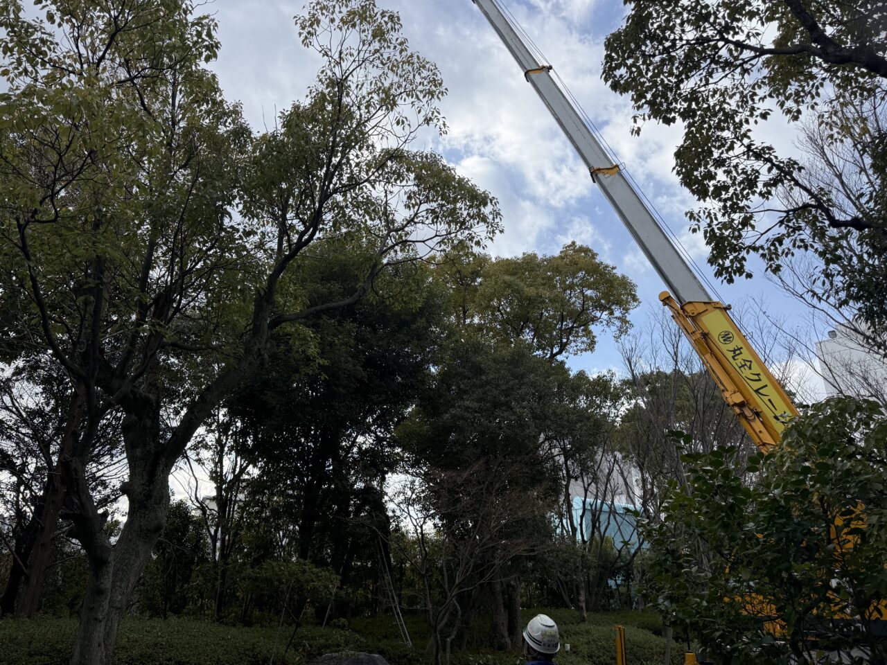 対象となる樹木は高さ・枝張りともに大きく、周囲には建物や通路がある環境だったため、重機とクレーンを使用した計画的な施工が必要な現場でした。