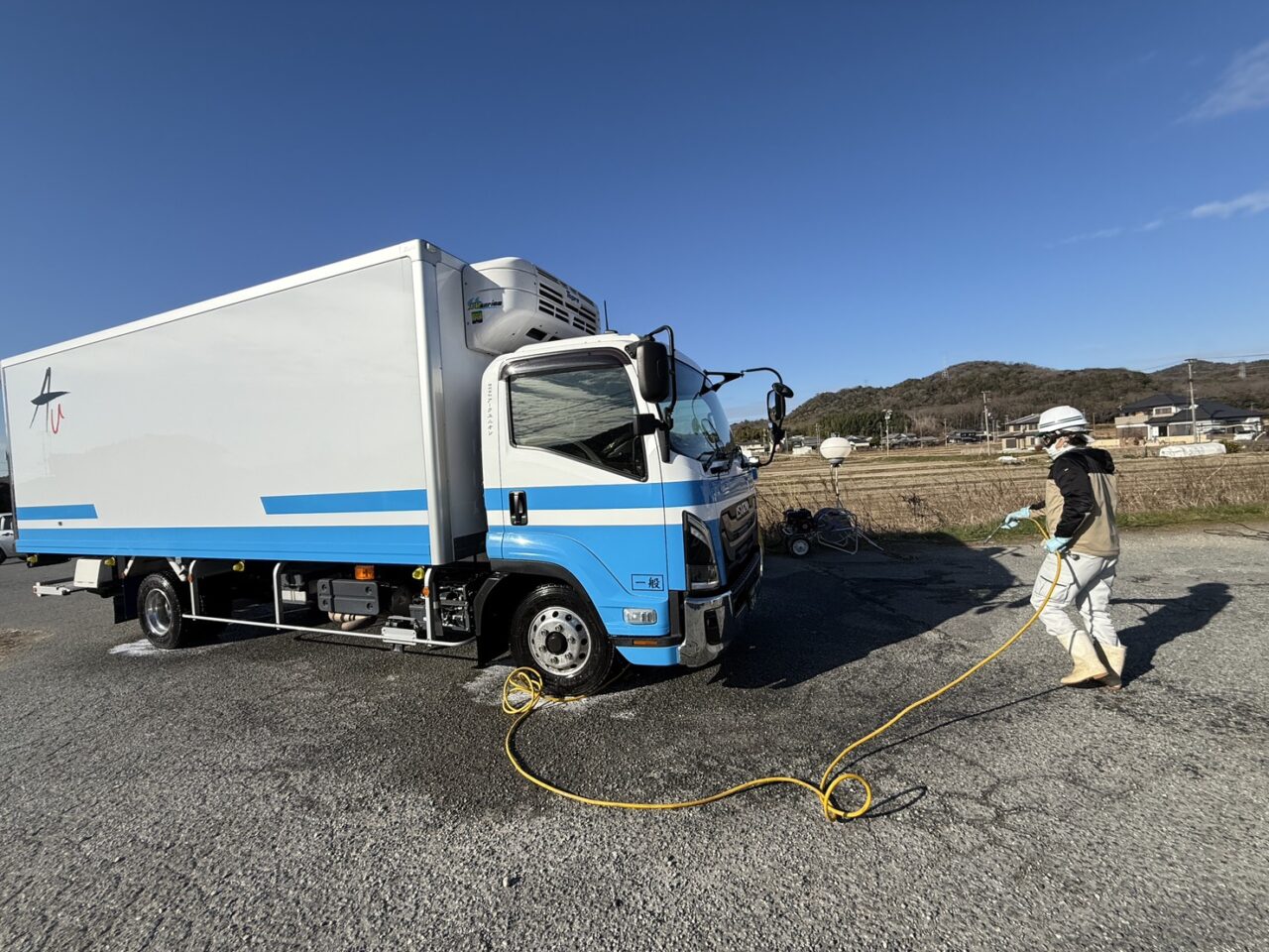 鳥インフルエンザ対策の消毒作業に従事しています。