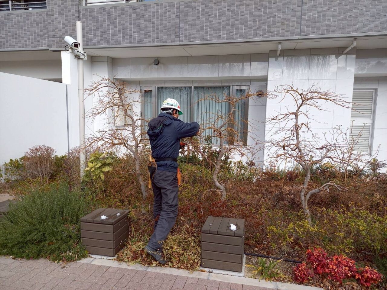 このたび、茨木市内にあるマンションにて年間管理業務を担当させていただきました。年間管理とは、単発の剪定や草刈りとは異なり、四季それぞれの気候や樹木の生育サイクルに合わせて、最適なタイミングで作業を実施していく総合的な緑地メンテナンスです。